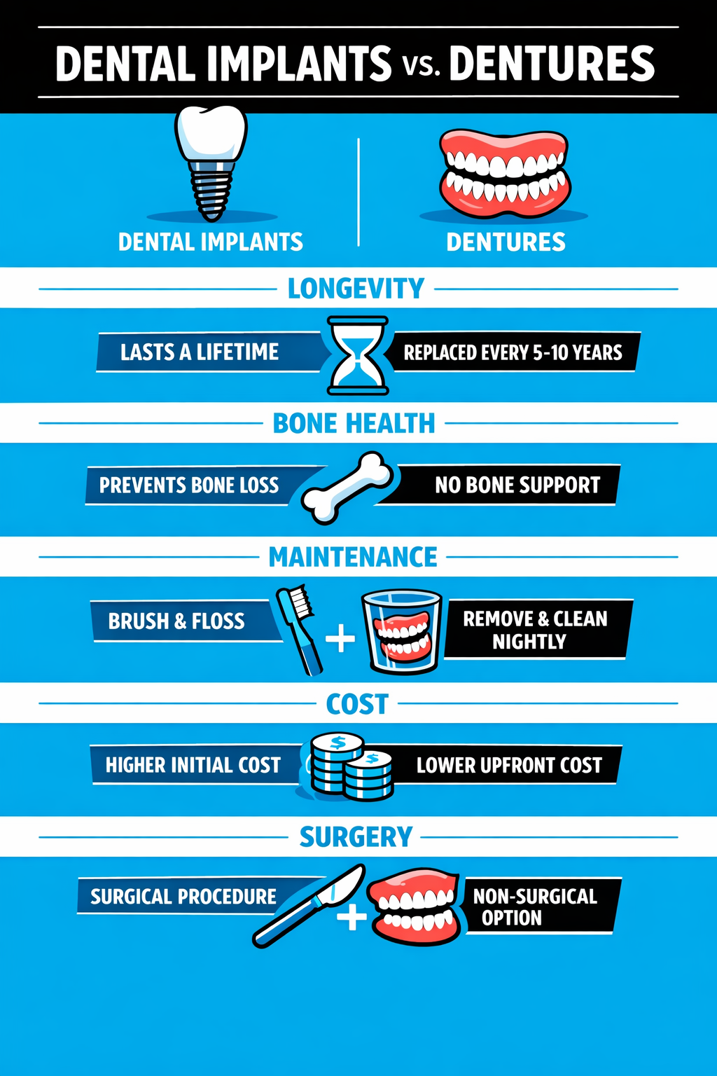 Both implants and dentures share the same purpose: replacing missing teeth and restoring function. However, they differ in meaningful ways when it comes to longevity, maintenance, bone health, and daily comfort. The following factors are worth considering as you evaluate your options: