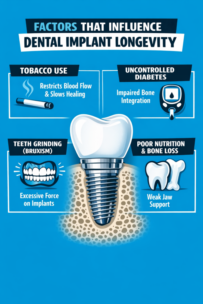 The following habits and health conditions also play a meaningful role in how long implants last:
